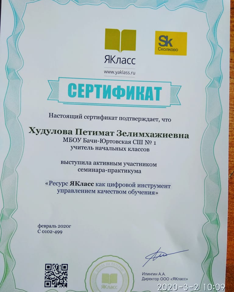 02.03.2020Учителя начальных классов Худулова П.З. и Ядуева Э.С. прошли очные семинары-практикумы обучения образовательного онлайн-ресурса, который позволяет проводить электронные тестирования и генерировать задания, уникальные для каждого ученика (www.yaklass.ru), по теме "Ресурс ЯКласс как цифровой инструмент управления качеством образования". По окончанию семинара, учителя получили на личные эл. адреса подтверждающие сертификаты.