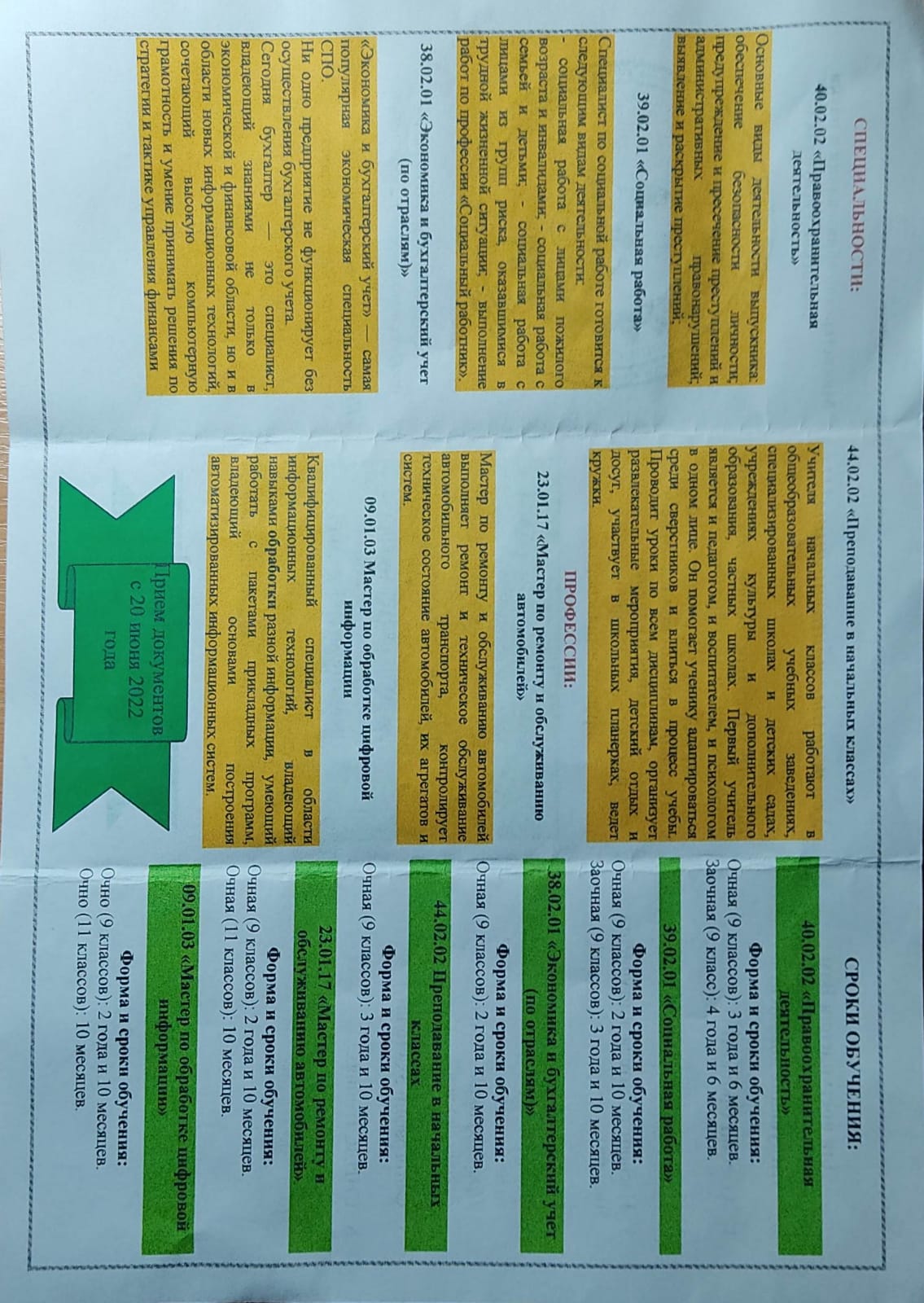 В ходе беседы сотрудники колледжа рассказали о приемной комиссии, о правилах и условиях приема, о том, что насколько важно в современном мире овладение техническими профессиями. Здесь же были розданы информационные буклеты учащимся.Также учащиеся ознакомились с теми направлениями подготовки, которые реализуются в колледже:1. Мастер по ремонту и обслуживанию автомобилей.2. Мастер по обработке цифровой информации.3. Правоохранительная деятельность.4. Социальная работа.5. Экономика и бухгалтерский учёт.6. Преподавание в начальных классах.В колледже имеется всё необходимое для организации полноценной учебной и научной работы: специализированные аудитории, современные лаборатории и мастерские, мультимедийные классы.Ребятам очень понравилось мероприятие. Спасибо большое организаторам!