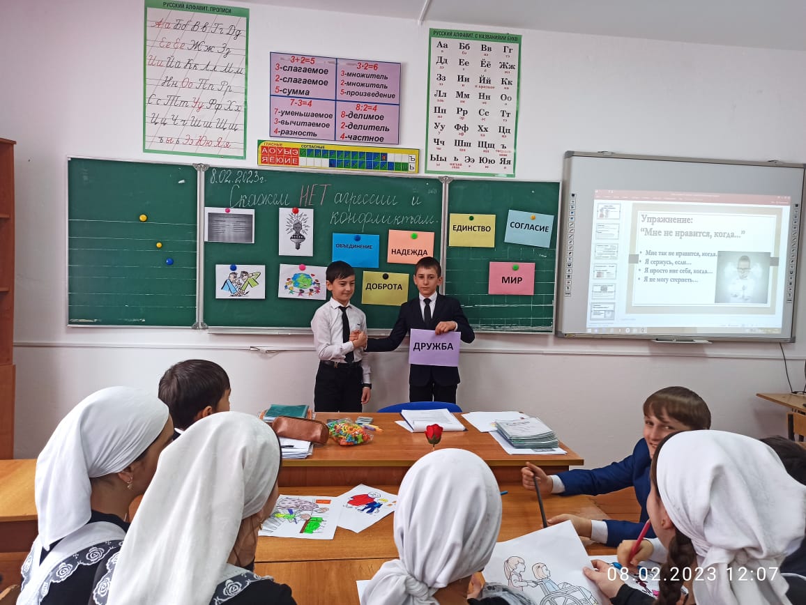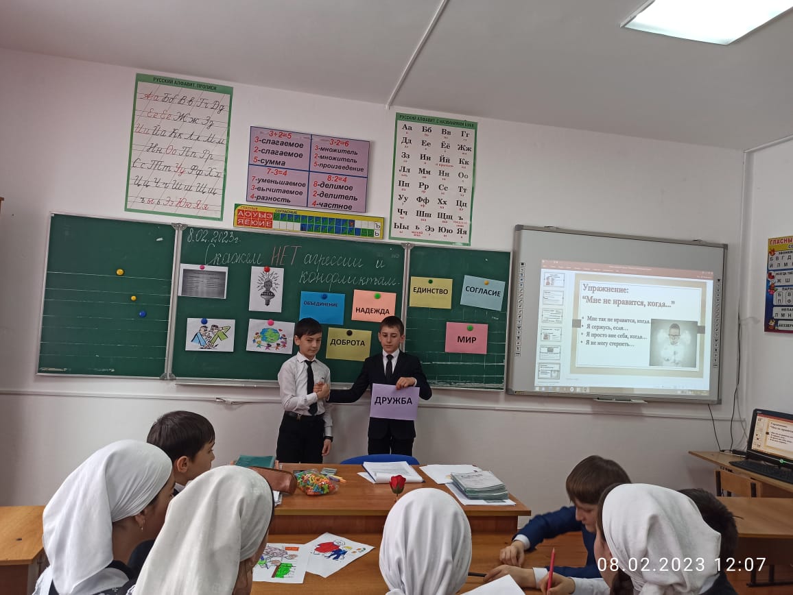 08.02.2023В рамках проекта «Успех каждого ребенка» национального проекта «Образование», на базе МБОУ «Бачи-Юртовская СШ №1» 8 февраля 2023 года в 5 «б» классе было проведено мероприятие на тему: «Скажем НЕТ агрессии и конфликтам», направленное на профилактику агрессивного поведения при взаимодействии с людьми. Провела классный руководитель 5 «б» класса Азимова Аминат Ахмедовна.Девиз занятия: «При общении не разрушай себя, других и окружающий мир».