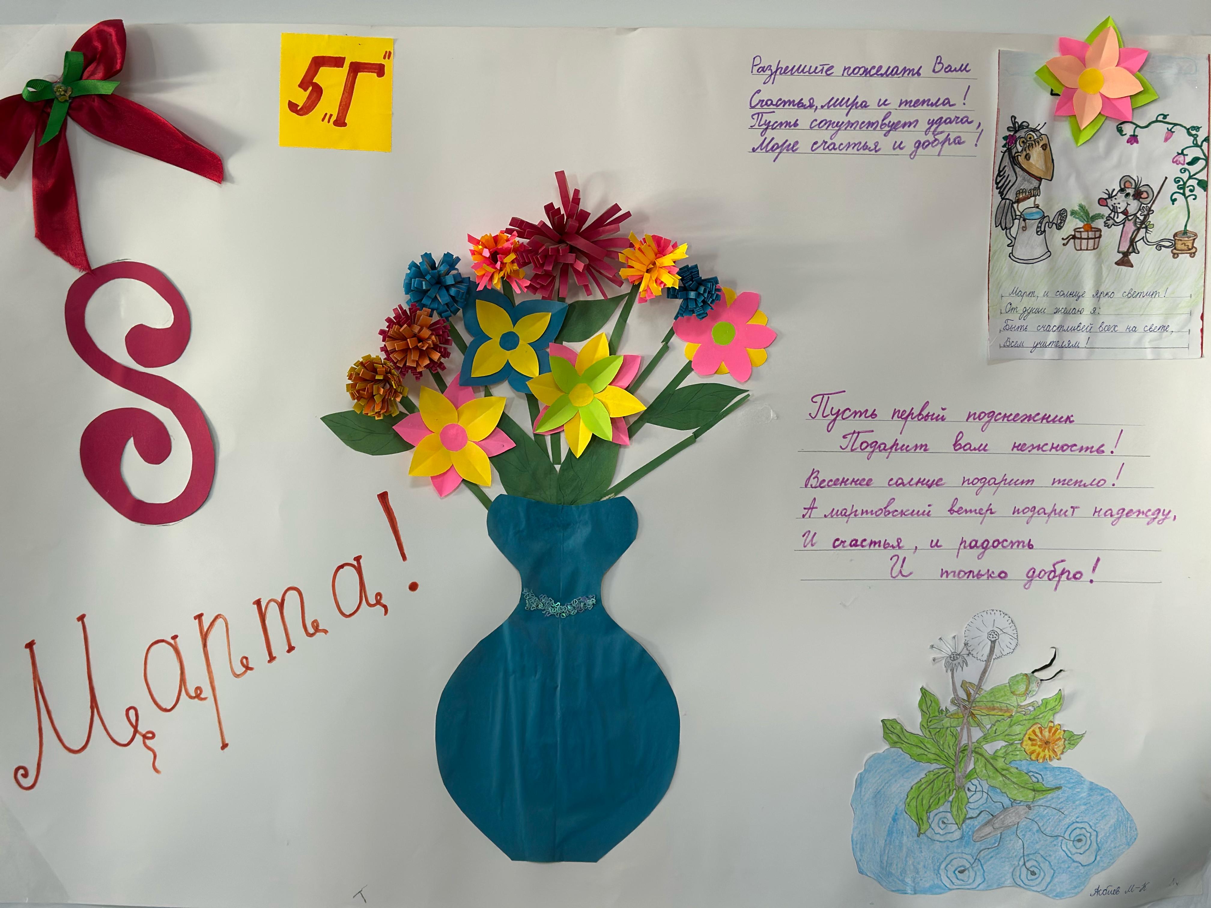 В преддверии праздника Международного женского дня по инициативе советника директора по воспитанию Солтамурадова Мовсара Алвиевича прошла акция «Вам, любимые». Ребята с увлечением мастерили яркие букеты из цветной бумаги, создавали оригинальные аппликации и объемные композиции. В глазах каждого ребенка читалось желание порадовать своих мам, бабушек и сестер.